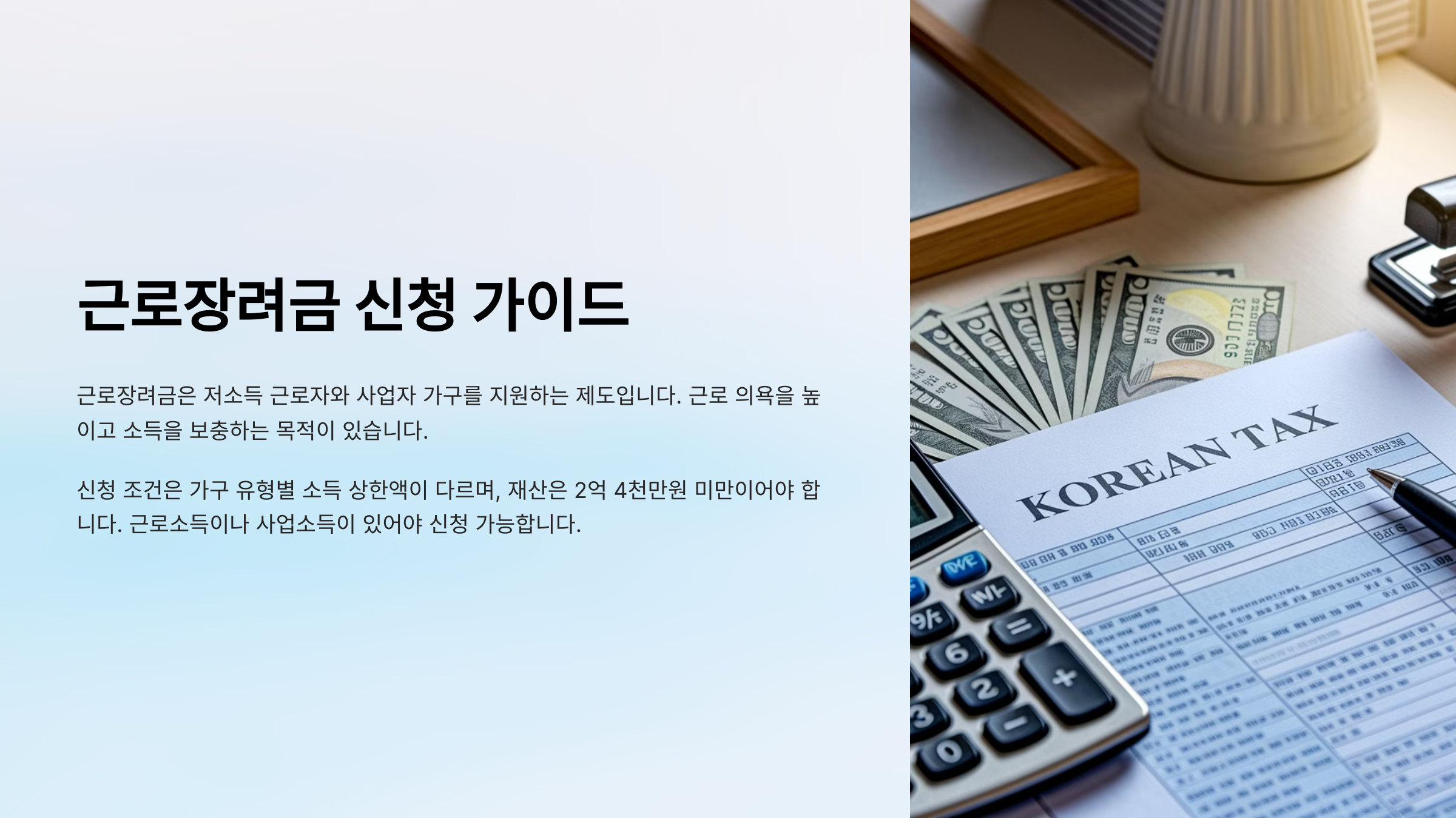 근로장려금은 저소득 가구의 근로를 장려하고 생활을 지원하기 위해 정부가 제공하는 지원금 제도입니다. 일정 소득 이하의 근로자, 사업자 또는 종교인이 대상이며, 매년 정해진 시기에 신청할 수 있어요. 💰 단순히 소득이 낮다고 해서 자동 지급되는 게 아니라, 정해진 요건을 갖추고 직접 신청해야 합니다.