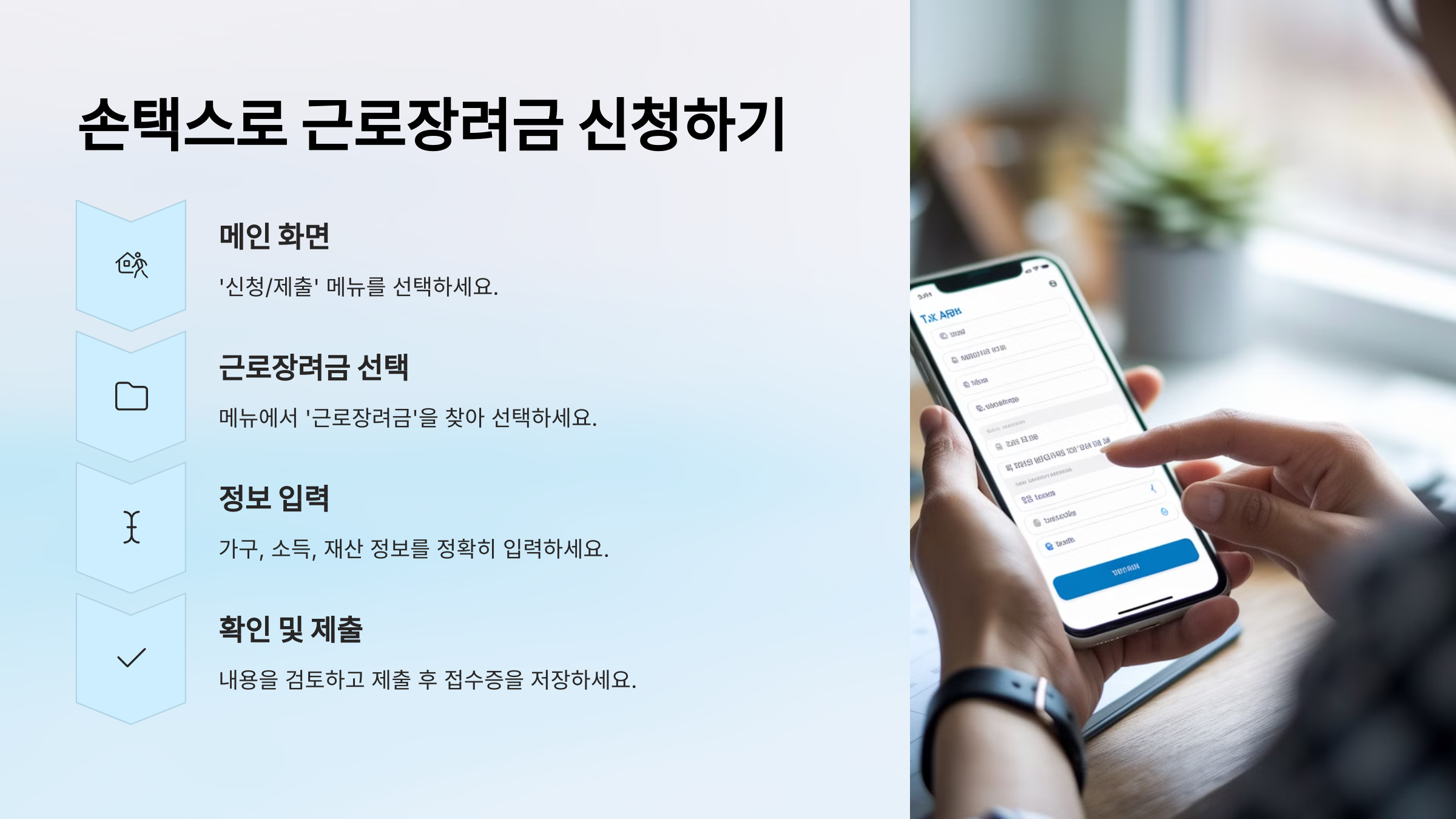 | 간편 신청 경로 | ‘신청/제출’ → ‘근로장려금 신청’ 선택 |