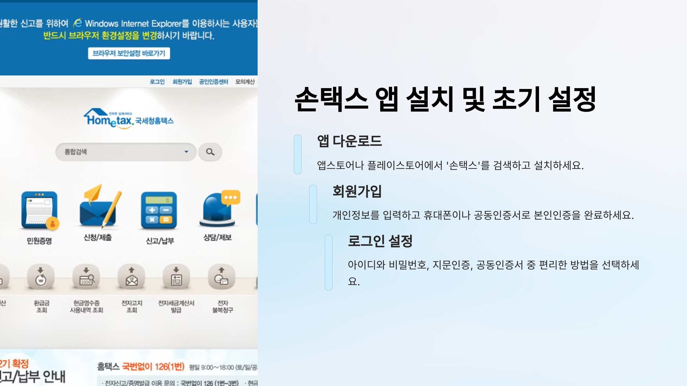 먼저 스마트폰에서 '손택스' 앱을 검색하여 설치해야 합니다. 안드로이드는 플레이스토어, 아이폰은 앱스토어에서 '국세청 손택스'라고 입력하면 바로 찾을 수 있어요. 꼭 ‘공식 앱’인지 확인하세요! 💡 설치 후엔 앱 권한 요청이 뜨는데 모두 ‘허용’해줘야 정상적으로 작동합니다.