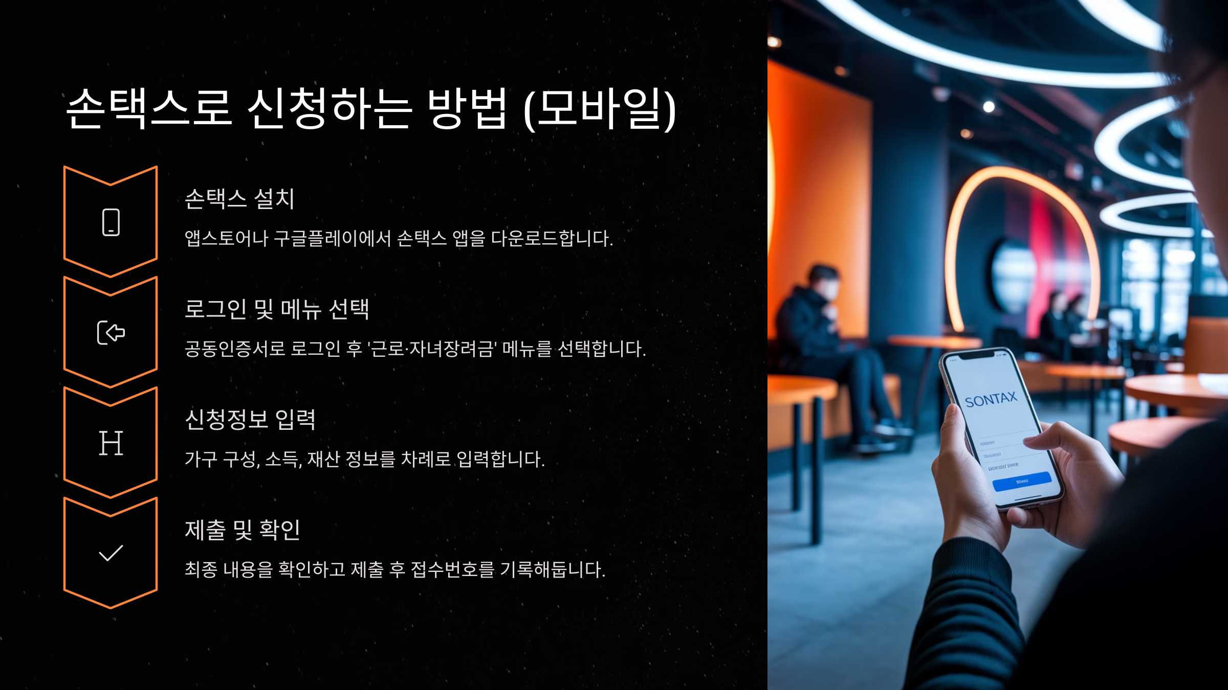손택스에서는 신청 과정이 단계별로 나뉘어 있어 사용자 친화적이에요. '기본정보 확인 > 소득·가구정보 입력 > 계좌정보 입력 > 제출' 순서로 되어 있고, 각 단계마다 자동저장 기능이 있어 중간에 앱이 꺼져도 걱정 없어요 😍 특히 직관적인 UI 덕분에 부모님도 쉽게 신청하시더라고요.