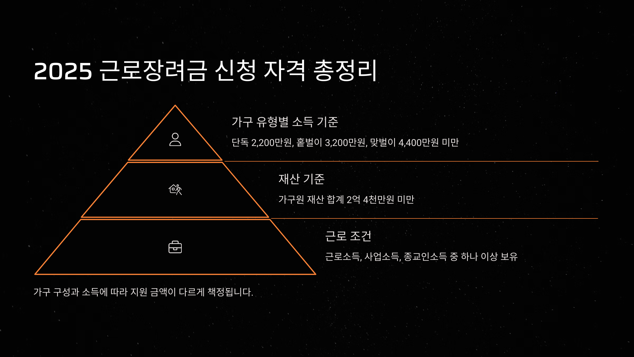 2025년 기준으로 단독 가구는 연소득 2,400만 원 이하, 홑벌이 가구는 3,800만 원 이하, 맞벌이 가구는 3,600만 원 이하입니다. 재산 기준은 신청일 기준 2억 원 미만이어야 하며, 주택, 차량, 금융자산 등을 포함해 계산됩니다. 참고로 최근에는 차량 소유 여부도 엄격히 심사되니 유의해야 해요 ⚠️