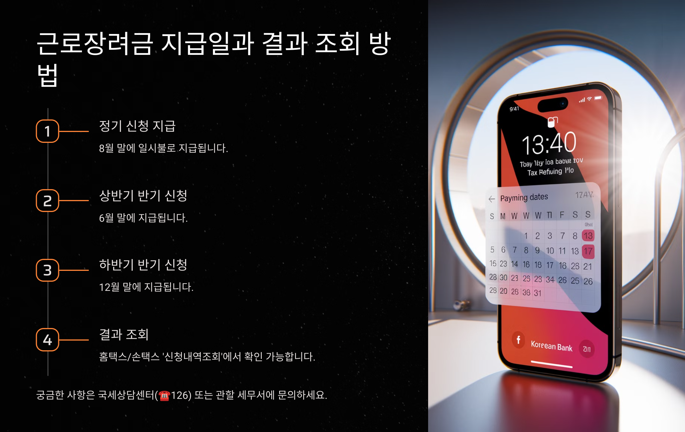 2025년 상반기 정기신청은 5월 1일부터 5월 31일까지이며, 심사를 거쳐 9월 말에 근로장려금이 지급됩니다. 반기신청자는 상반기분은 9월, 하반기분은 이듬해 3월에 각각 지급돼요. 국세청 발표에 따르면 올해도 신청자 수가 증가할 것으로 예상돼 처리 기간이 지연될 수 있으니 미리 신청하는 게 좋아요 🔔